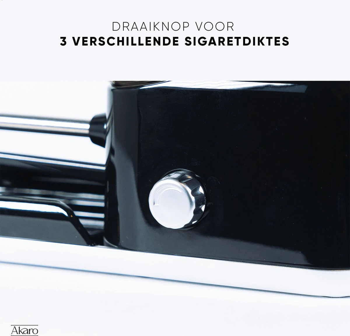 De Akaro elektrische sigarettenmaker maakt goedkoop roken gemakkelijk, ondanks alle prijsstijgingen in de tabaksindustrie. De sigarettenmaker is ontwikkeld om de perfecte sigaret te maken. Door de 3 verschillende dichtheidsstanden zijn de sigaretten zo strak als u zelf wilt. Door de hoogwaardige kwaliteit wordt het maken van sigaretten snel, makkelijk en voordelig!