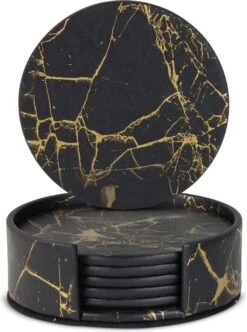 Castagnola Lederen Onderzetters Met Houder – Onderzetters Voor Glazen – Onderzetters Design – Onderzettersset – Drink Onderzetters – Leder – Leren Onderzetters – Set Van 6 – Zwart/Goud