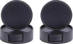 Onderzetters voor glas of mok van leer. Twee setjes van 6 stuks in de bijpassende houders. De kleur zwart past in vrijwel elk interieur. Met deze lederen onderzetters bescherm je jouw tafel of bureau tegen kringen en krassen.