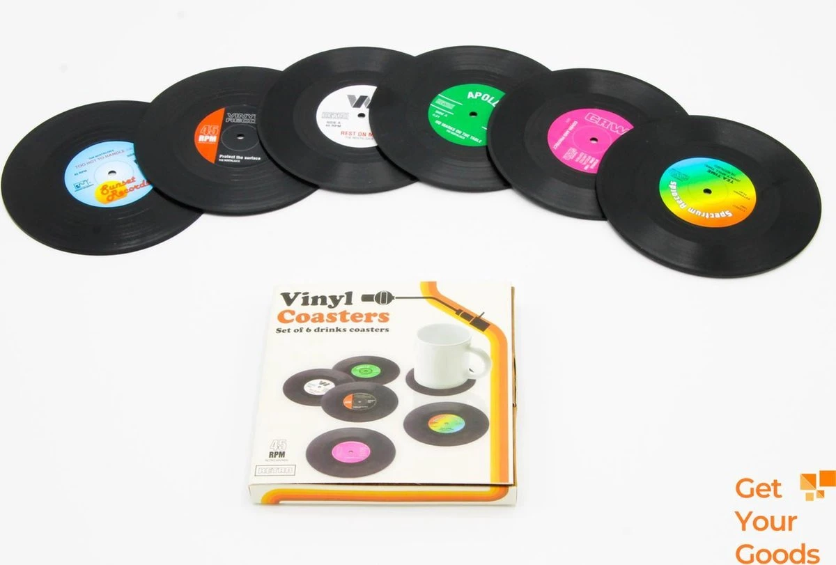 Vinyl platen raken nooit uit de mode. Je herbeleeft de tijden van lp’s en platenspelers helemaal opnieuw met deze hippe onderzetters. Zo zie je maar weer dat muziek de oplossing is voor alles, ook voor de kringen op je tafel. De onderzetters hebben een anti-slip onderkant. In de verpakking zitten 6 verschillende vinyl platen LP onderzetters.