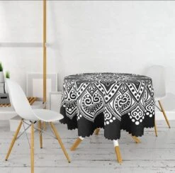 Tafelkleed Rond Ø140cm – De Groen Home – Bedrukt Velvet Textiel – Witte Mandala Op Zwart – Tafelkleed