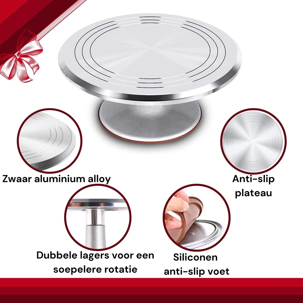 - Draaibaar plateau: biedt gemak en maakt perfectie mogelijk bij het decoreren van je taarten.