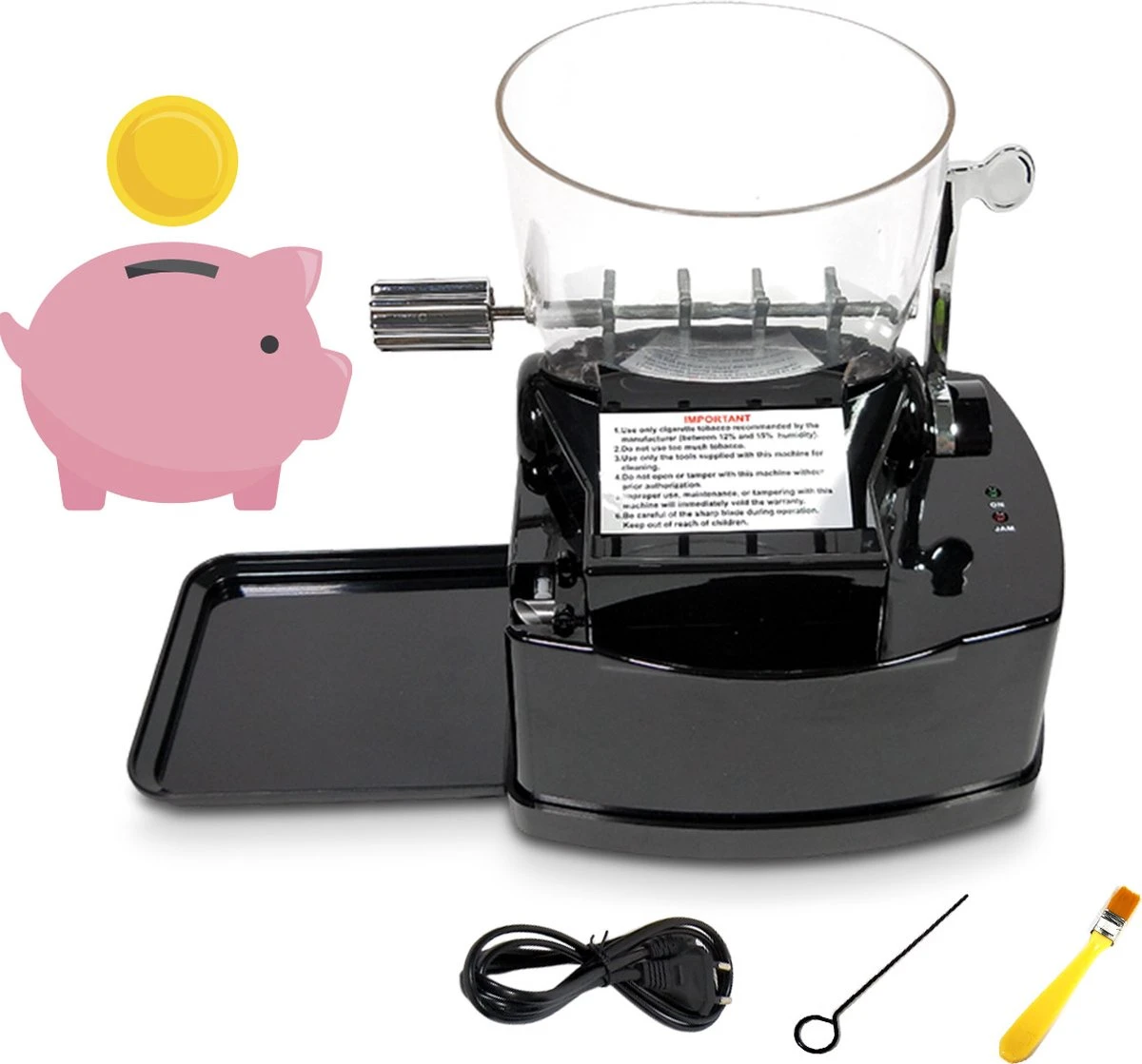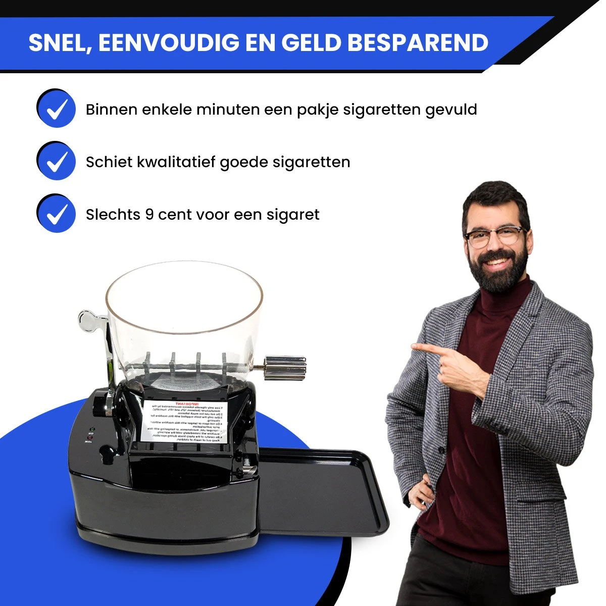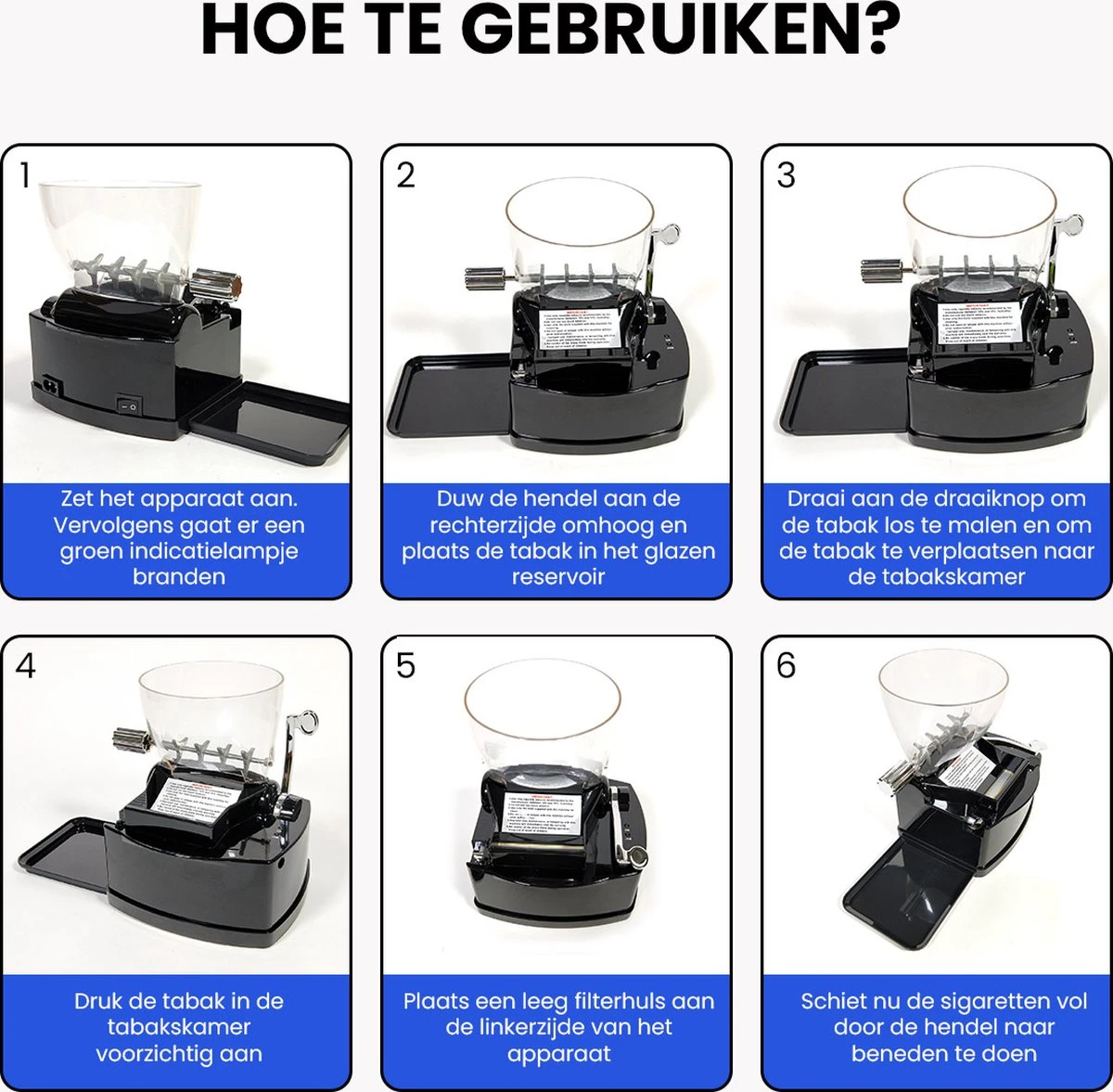 Het handmatig draaien van sigaretten is een vervelend en tijdrovend klusje. Gelukkig biedt een elektrische sigarettenmaker dan een perfecte oplossing. Stop de tabak in het reservoir draai aan de hendel en voer een 8mm sigarettenhuls in. Binnen 3-5 minuten heb jij een pakje vol perfect gedraaide sigaretten!